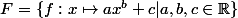 Reste un point important : ici la variable sur laquelle on minimise est une fonction, soit a priori un truc qui vit dans un espace de dimension infini. Si on ne mets pas de contraintes fortes sur ces fonctions il est facile de trouver une fonction (même continue ou C^\infty) qui donne une distance nulle. Quasi-systématiquement on souhaite que la fonction f puisse être paramétrée par un nombre fini de paramètres. Dans un autre fil Dlzlogic a donné un certain nombre d'exemples de classe de fonctions. J'en rappelle une ou deux (par simplicité je suppose aussi que n=1) ici pour être complet :