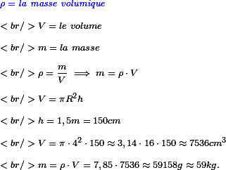 Sur le chantier de la futur maison M.Statham croise un maçon qui semble avoir des difficultés a porter une tige d acier pleine de forme cylindrique .Cette tige mesure 1.5 m de long et a un rayon de base de 4cm.L acier a une masse volumique de 7.85g/cm3