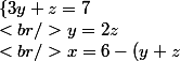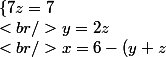 +z=7 \\<br />y=2z \\<br />x=6-(y+z))