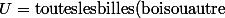}}\quad Q_b = {\rm{billes bois}}\quad {\rm{Q}}_{\rm{n}} = {\rm{billes noires}}\quad {\rm{Q}}_{\rm{B}} = {\rm{total des billes en bois}} \\ <br /> {\rm{U - }}Q_B = U - U\left( {\frac{5}{8} + \frac{7}{{10}}} \right) \\ <br /> Q_B = U\left( {\frac{5}{8} + \frac{7}{{10}}} \right) = \frac{4}{5}U = \\ <br /> Q_b = Q_B \frac{5}{8} = \frac{4}{5}U \cdot \frac{5}{8} \\ <br /> Q_n = \frac{U}{2} \\)