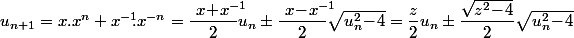 ^2\!-\!u_n\,x^n\!+\!1\!=\!0\ <br />\text{ donc }\ <br />x^n\!=\!\dfrac{u_n\!\pm\!\sqrt{u_n^2\!-\!4}}{2}<br />\text{ et }<br />\ x^{-n}\!=\!\dfrac{u_n\!\mp\!\sqrt{u_n^2\!-\!4}}{2})