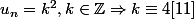 Bonsoir, regarde du côté de la réciproque de l'implication que tu as démontrée. Si k est congru à 4 modulo 11, à quelle condition sur n as-tu u_n = k^2 ? Même chose pour k congru à 7 modulo 11.