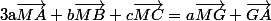 +b\(\vec{MG}+\vec{GB}\)+c\(\vec{MG}+\vec{GC}\)= (a+b+c)\vec{MG}+a\vec{GA}+b\vec{GB}+c\vec{GC}= (a+b+c)\vec{MG})