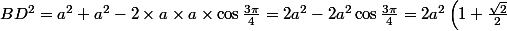 BD = racine ( 4a²racine de 2 ) ( théoreme d'al kashi avec l'angle BCD = 180-45 = 135 ° )