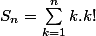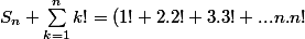 + (1! + 2! + ... + n !) \; = \; 1!(1+1) + 2!(2+1) + ... + n!(n+1) = \sum_{k=1}^n (k+1)!)