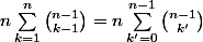 !(n-k)!}\\<br /> &=& \sum_{k=1}^n n \frac{(n-1)!}{(k-1)!(n-k)!}\\<br /> &=& \sum_{k=1}^n n \binom{n-1}{k-1}\\<br /> &=& n \sum_{k=1}^n \binom{n-1}{k-1}\\<br /> \end{eqnarray})
