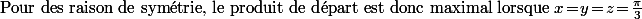 \sin\big(\frac{y}{2}\big)\!=\!\frac{1}{2}\Big[\!\cos\big(\frac{x-y}{2}\big)\!-\!\cos\big(\frac{x+y}{2}\big)\!\Big]\text{qui est maximal}\cr\text{lorsque }\cos\big(\frac{x-y}{2}\big)\text{ est maximal, c'est \`a dire lorsque }x\!=\!y.)