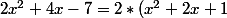2x²+4x-7 4²-4*2*(-7)=72 comme c'est > que 0, deux solutions (-4-;)72)/2*2 et (-4+;)72)/4