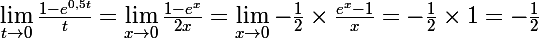 car lim t = 0 et lim de 1-e^0*5t=1 donc 1/0 = +oo