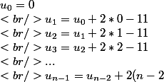 - 11 \\<br />u_n = u_{n - 1} + 2(n - 1) - 11)