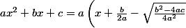 \times \left(x + \frac{b}{2a} - \frac{\sqrt{b^2 - 4ac}}{\sqrt{4a^2}} \right) = a\left(x + \frac{b}{2a} + \frac{\sqrt{b - 4ac}}{2a}\right) \times \left(x + \frac{b}{2a} - \frac{\sqrt{b - 4ac}}{2a}\right) = 0)
