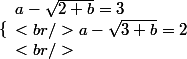 = a - \sqrt{x+b} = 3\ ssi\ a-\sqrt{2+b}=3)