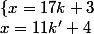 mon interpretation mathématique est : x congrus 3 mod(17)
