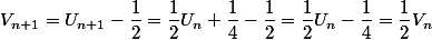 on trouve bien vn+1=(1/2)(Un-1/2)=(1/2)Vn donc suite géométrique de rason 1/2