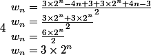 + 3}}{2} + \frac{{3 \times {2^{n + 1}} + 4\left( {n + 1} \right) - 3}}{2}\\<br />{w_{n + 1}} = \frac{{3 \times {2^n} \times 2 - 4\left( {n + 1} \right) + 3}}{2} + \frac{{3 \times {2^n} \times 2 + 4\left( {n + 1} \right) - 3}}{2}\\<br />{w_{n + 1}} = \frac{{6 \times {2^n} - 4n - 4 + 3 + 6 \times {2^n} + 4n + 4 - 3}}{2}\\<br />{w_{n + 1}} = \frac{{12 \times {2^n}}}{2}\\<br />{w_{n + 1}} = 6 \times {2^n}\\<br />{w_{n + 1}} = 2{w_n}<br />\end{array})