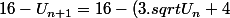 \\<br />0 \leq 16 - u_{n} &\leq& \frac{3}{4} \left( 16 - u_{n-1}\right) \\<br />. \\<br />. \\<br />. \\<br />0 \leq 16 - u_{1} &\leq& \frac{3}{4} \left( 16 - u_0\right)<br />\end{array})