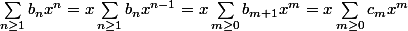 b(x)=\sum_{n=0}^{+\infty}(\sum_{k=0}^{n} a_k b_{n-k-1})x^{n+1}<br />=\sum_{n=1}^{+\infty}(\sum_{k=0}^{n-1} a_k b_{n-k-1})x^{n})