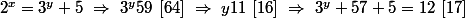 Mais pourquoi modulo 17 ? On cherche un 3^y+5 qui vaut un 2^x. Et un 2^x modulo 17, ça ne fera jamais 0.