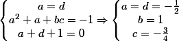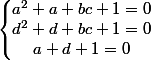 = 0\\c(a+d+1) = 0 \end {matrix} \Rightarrow \left \{ \begin {matrix} a=z_1 \vee a = z_2 \\d=z_1 \vee d=z_2\\b=0 \vee a+d=-1\\c=0 \vee a+d=-1 \end {matrix})