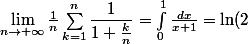 (n+k+1)}} \le \sum_{k=1}^n \frac{1}{n+k} = \frac{1}{n} \sum_{k=1}^n \dfrac{1}{1+\frac{k}{n}})