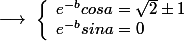 tex] \left \{ \begin{array}{l} e^{-b}cos a = \sqrt2\pm1