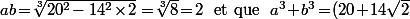 haithem6 a écrit:montrer que a= ∛(20+14√2) + ∛(20-14√2) est un entier (on utilise (a+b)^3 mais je bloque )
