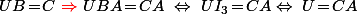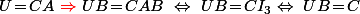 Lorsque tu as ton égalité UB=C puis que tu multiplie les deux membres à droite par A, tu obtient effectivement UBA=CA ce qui signifie qu'on a l'implication UB=C => UBA=CA.
