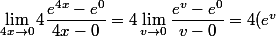 lim(x-->0) [(e^(-x) - 1)/(e^(4x - 1)] est une indétermination du type 0/0 --> Règle de Lhospital.