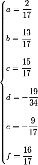 je trouve a=6/17,b=5/17,c=11/17 , d=-23/34, e=-10/17, f=14/17