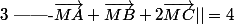 donc une fois que tu as réduis la somme vectorielle tu peux remplacer ||-MA + MB + 2MC|| par ||...MG|| et tu résouds ||-MA + MB + 2MC|| = 4.