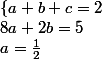 \\8a+2b=5\rm~~(2)<br />[TEX]\{a+b+c=1\rm~~(1)\\8a+2b=5\rm~~(2)\\30a=15\rm~~(3)<-2\times(3)+3\times(2))