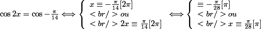 cos 2x = cos (-pi/14)Je fait donc : 2x = -pi/14