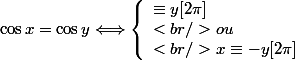 = \cos \left( y \right) \Leftrightarrow x = y+2k\pi \qquad \text{ou} \qquad x=-y+2k\pi)
