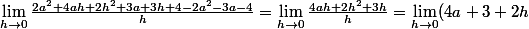 voila ce que je trouve pour le 1 , f'(a)=(2(a+h)²+3(a+h)+4)-(2(a)²-3(a)+4)/h