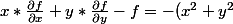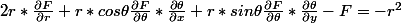 \\<br /> r*cos \theta [\frac{\partial F}{\partial r}*\frac{1}{cos \theta} + \frac{\partial F}{\partial \theta}*\frac{\partial \theta}{\partial x}]+r*sin \theta [\frac{\partial F}{\partial r}*\frac{1}{sin \theta} + \frac{\partial F}{\partial \theta}*\frac{\partial \theta}{\partial y}] <br />-F= -r^2)