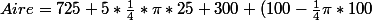 Aire totale=37 carrés 5*5 + 5*1/4 cercle rayon 10 (rouge) + 3/4 cercle rayon 15 (vert fluo) + 1 carré 20*20 - 1 cercle de rayon 5 (rose)