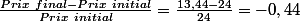 Reduc final appliquée a ta robe : prix après-prix avant / prix avant = (24-13.44)/24=-0.44