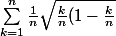 D'accord, vue avec le produit comme tel je n'y ai pas pensé directement. u_n = \prod_1^n (1 + \dfrac {\sqrt {k(n - k)}}{n^2}) = \prod_1^n (1 + \dfrac 1 n \sqrt {\dfrac k n (1 - \dfrac k n}) Puis ln( \prod_1^n (1 + \dfrac 1 n \sqrt {\dfrac k n (1 - \dfrac k n}&...