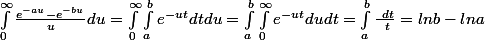 Merci Nightmare, je pensais que Fubini ne suffisait quand on intègre par rapport à u sur [0,+\infty[ : je me serais embêté à faire : lim_{c->+\infty} \int_0^c \int_a^b f(u,t)dt du=lim_{c->+\infty} \int_a^b\int_0^c f(u,t)du dt = \int_a^b lim_{c->+\infty} \int_0^c f(u,t)dt du e...
