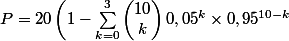 Pour mon exemple concret, si j'ai bien compris ce que vous disiez, je pense que le plus simple est peut- être de faire 20*(1 - (la somme des chances d'obtenir exactement 0 fois, 1 fois , 2 fois ou 3 fois la face 1)).