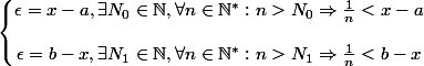 Il suffit de prendre un x vérifiant a<x<b et de montrer qu'il existe un entier n>0 tel que a+1/n<x<b-1/n.
