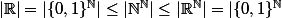 ^{\mathbb{N}}| =|\{0,1\}^{\mathbb{N}^2}|=|\{0,1\}^{\mathbb{N}}|=|\mathbb{R}|)