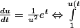 } u^2 d u = \int_0^t e^t dt \Leftrightarrow \frac{1}{3}(u^3(t) - 1) = e^t - 1 <br />\Leftrightarrow u(t) = \sqrt[3]{3 e^t - 2})