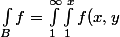 d(x,y) =\qquad \bigint_{Proj_{\mathbb{R}}^{(y)}(B)}\ \ (\bigint_{B^y} f(x,y) dx) dy =\qquad \bigint_{Proj_{\mathbb{R}}^{(x)}(B)}\ \ (\bigint_{B^x} f(x,y) dy) dx)