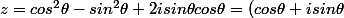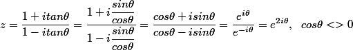 ^2}{(1-i\tan \theta )(1+i\tan \theta )} \\ \\z=\frac{1+2i\tan \theta-\tan ^2\theta }{1 + \tan ^2\theta } \\ \\z=\frac{1-\tan ^2\theta }{1+\tan ^2\theta }+\frac{2\tan \theta }{1+\tan ^2\theta }i \\ \\z=(1-\tan^2 \theta )\cos^2\theta + 2i\tan \theta \cos ^2\theta \\ \\z=(1 - \frac{\sin ^2\theta }{\cos ^2\theta })\cos ^2\theta + 2i\frac{\sin \theta }{\cos \theta }\cos ^2\theta \\ \\z=\cos ^2\theta -\sin ^2\theta +2i\sin \theta \cos \theta)