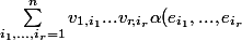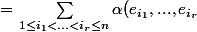 = \alpha \Big( \displaystyle \sum_{i_{1} = 1 }^n v_{1,i_{1}} e_{i_{1}} , ... , \displaystyle \sum_{i_{r} = 1 }^n v_{1,i_{r}} e_{i_{r}} \Big) = \displaystyle \sum_{i_1 , ... , i_r = 1}^n v_{1,i_{1}} ... v_{r,i_{r}} \alpha ( e_{i_{1}} , ... , e_{i_{r}} ) $)