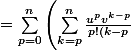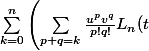 ^{p+q}\right) \cr=\sum_{p=0}^{n}\left( \sum_{k=p}^{p+n}{u^pv^{k-p}\over p!(k-p)!}L_n(t)^{k}\right)\cr<br />=\sum_{p=0}^{n}\left( \sum_{k=p}^{n}{u^pv^{k-p}\over p!(k-p)!}L_n(t)^{k}\right)\cr<br />=\sum_{k=0}^{n}\left( \sum_{p=0}^{k}{u^pv^{k-p}\over p!(k-p)!}L_n(t)^{k}\right)\cr)