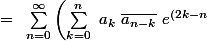 (\sum_{n=0}^{\infty} \text{ }\overline{a_nz^n}) \text{ }= \text{ }\sum_{n=0}^{\infty}\left(\sum_{k=0}^{n}\text{ } a_k e^{ikt}r^k \text{ }\overline{a_{n-k}e^{i(n-k)t}r^{n-k}})\right))