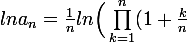 \Big)= \frac{1}{n}\sum_{k=1}^{n}ln\Big(1+\frac{k}{n}\Big)\equiv \int_{0}^{1}ln(1+x)dx=..=2ln2-1 => a_n=\frac{4}{e})