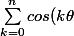 }=<br />\sum\limits_{k=0}^n{Re}(e^{ki\theta})\\=<br />Re(\sum\limits_{k=0}^n{e^{ki\theta}})=<br />Re(\sum\limits_{k=0}^n{(e^{i\theta})^k})\\=<br />Re\bigg({{{1-(e^i\theta})^{n+1}}\over{1-e^{i\theta}}}\bigg)=<br />Re\bigg({{1-cos((n+1)\theta)-isin((n+1)\theta)}\over{1-cos(\theta)-isin(\theta)}}\bigg)\\=<br />Re\bigg({\big[{1-cos((n+1)\theta)-isin((n+1)\theta)\big]\big[1-cos(\theta)+isin(\theta)\big]}\over{(1-cos(\theta))^2+sin^2(\theta)}}\bigg)<br />\\={{1-cos(\theta)-cos((n+1)\theta)+cos(\theta)cos((n+1)\theta)+sin({\theta})sin((n+1)\theta)}\over{1-2cos(\theta)+cos^2(\theta)+sin^2(\theta)}})